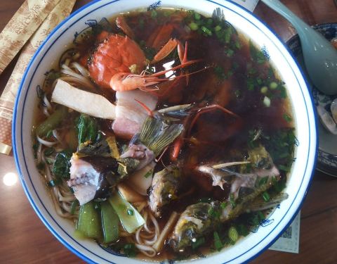虽然远在太平镇,可是好多很远地方驱车赶来吃面的人,生意是特别的好,桌子不是很多,去晚了要等位,这次点了招牌昂刺鱼面,面里有昂刺鱼,小螃蟹,虾,都是爽口的东西,一起煮出去的汤面,鲜的要命,还点了小肠...