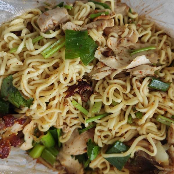 单位小妹妹安利给我的一家拌鸡架,因为最近单位伙食不好,所以他们总点他家的外卖,于是我也尝试一下。 他们平常点的是拌鸡架,我只吃鸡架吃不饱,于是加了面,他们又推荐我加面的话要点鸡腿,否则从面里边往外挑鸡骨头太闹心了,于是拌鸡架就这么变成了鸡腿拌面。 整体还好吧,分量还是挺足的,拌的方便面倒是挺多的,正常都应该够吃。鸡腿也是完整的,没有因为拆碎了拌进来就缺斤短两的情况。 味道没啥太大的特点,因为鸡腿本身就没多大,面多了以后肉被淹没了,所以很难起到点缀的作用,最后感觉自己就是吃了一份加量的辣煮方便面。 当然了,人家最出彩的味道是酸甜口的,我为了适合自己的口味,点了麻辣口的,也有可能是因为店家不太擅长这个口味的原因。 整体上还好吧,想吃的小伙伴们,建议按照店家擅长的,老老实实点个拌鸡架吧。