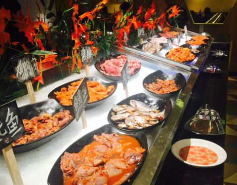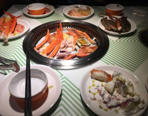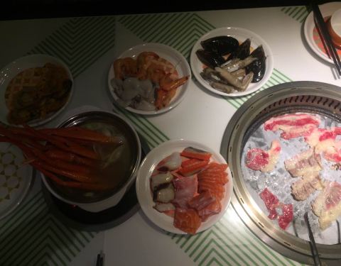 吃自助餐,常去的地方都要预约所以就选择了这家餐厅,好在离家比较近。这家餐厅位于新的商业中心所以餐厅的装修也显得非常新,门口的三文鱼还是成功的吸引了我的目光。餐厅看上去很大,里面的装修比较文艺,光线也非常明亮。 这里的海鲜还算比较多吧,花蛤,淡菜都是新鲜的,其他的比如虾和虾菇都是煮过的。餐厅有烧烤和火锅还有其他熟菜,东西看着都还算新鲜。饮料有果汁,啤酒红酒等。对于团购价85的价格,性价比还算蛮高的,赤身,烤肉什么的都不缺。但是店里自制的烧烤,扇贝和生蚝味道就差了一些。 这里的服务还算不错,值得一去。