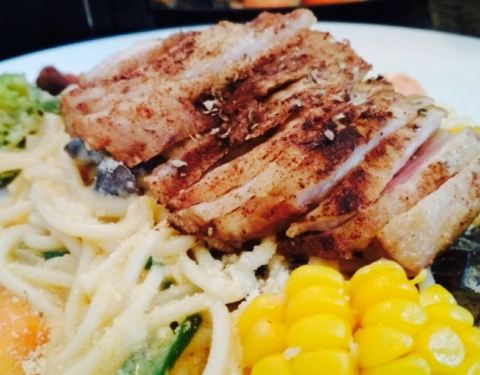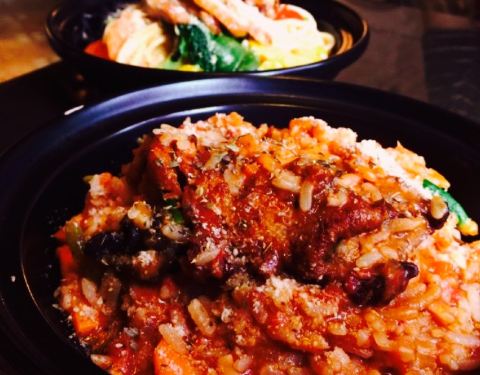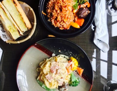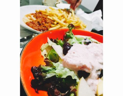 意面和炖饭其实配菜都大同小异,不过酱料都是自制,总体味道还不错,分量适合,沙拉底下的菜单调一些