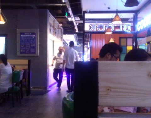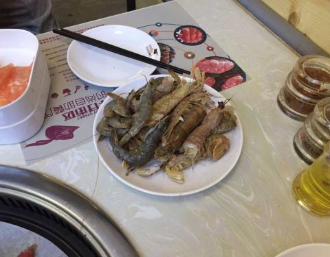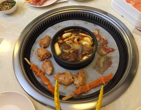 【位置】江南万达四楼,扶梯旁边就可以见到。【环境】饭点去的人挺多的,有点吵杂,毕竟是自助。【口味】这里食材有很多种,有烧烤,有火锅,有一点熟食,有凉菜,还有海鲜,甜点,蛋糕,糕点寿司,披萨之类的。锅是外围可以烧烤里面是小火锅的那种,由于我们太懒了也没有技术所以全程要的熟食,里边的火锅的锅又太小了,当成火锅的自助吃的也不舒服。海鲜品种不多,皮皮虾比较受欢迎。熟食里面羊肘子也不错,但是吃起来有点麻烦。饮料方面有类似于鸡尾调味酒的饮料自助,也有那些机打饮料,不过机打饮料不好喝,西瓜汁居然是粉色的,还有酸奶味道也不行,网上有团购,五个人没吃多少就撑了??。【ps】吃多少就那多少,进入的时候要压20,貌似剩多了要扣钱。还有限定吃两个小时。【服务】人太多了,服务员太忙了,好几次需要服务都叫不来。