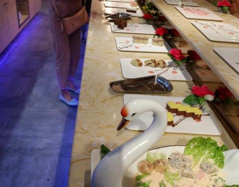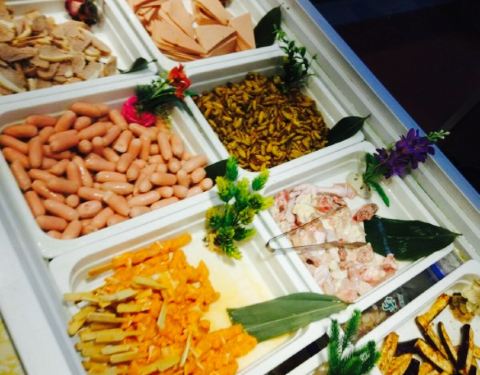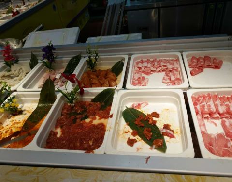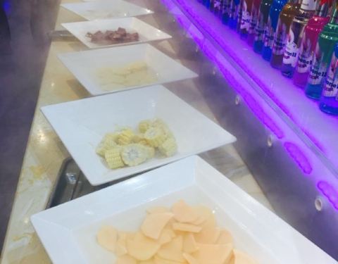 位置在四楼,门口有迎宾,十分热情。到了直接指引到前台,结账,交20押金,然后安排位置。有熟食,火锅,烤肉,锅底无需重新收费,上锅底前服务员会询问要什么样的锅底,辣或者清汤,可以按个人口味进行选择。菜品类型很多,口味多样。环境装饰的也很好看,菜品旁边加了加湿器,不仅可以保证叶子类蔬菜不会脱水,并且还增添了许多美感。菜式包括中餐,大菜,中点,西点,可以满足大部分人的需求。表示我还没有尝遍里面的菜品就已经饱了。有机会的话,肯定还会带朋友光顾这家店,第一次的感受,让人期待而去满足而归。