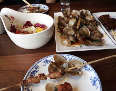 唐山连锁过来的著名烧烤店,按着网友们的推介点了几样。烤排骨炒鸡美味,就是太小啦。羊肉小串也入味,非常美味,半斤也不错。一锅贝壳那个忘记叫啥了,沙子没吐干净,有些牙碜。猪蹄糯糯的,烤的很爽口。鸡爪子差强人意,一般。烤菠萝包对于我来说,太油了。那个永不分离,里边是糯米外面是烤梨,底下是凉凉的黄桃,不太符合我的口味。还点了一个腰子忘记拍了,老爸说还行。总的来说味道还是很不错的,就是价钱略贵。
