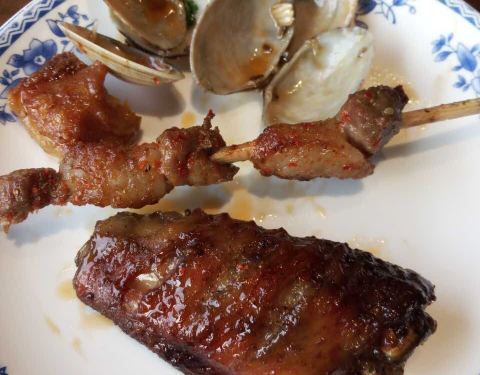唐山连锁过来的著名烧烤店,按着网友们的推介点了几样。烤排骨炒鸡美味,就是太小啦。羊肉小串也入味,非常美味,半斤也不错。一锅贝壳那个忘记叫啥了,沙子没吐干净,有些牙碜。猪蹄糯糯的,烤的很爽口。鸡爪子...