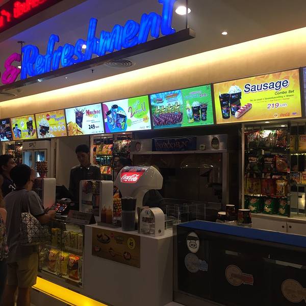 Terminal21”是一家以机场航站楼为设计概念的主题购物中心。各国品牌的东西可以在这里买到。而且每一层楼都有一个代表着不同国家的旅游主题,售卖的东西和装修风格都有着这些国家的特征。“Terminal21”从地下层算起,一共有9层,每一层的装饰风格分别是加勒比海岸、罗马、巴黎、东京、伦敦、伊斯坦布尔、叁藩市及唐人街。当然B1有大家来泰国不能错过的DQ,还有各种保养品日用品不可错过的BOOTS~6楼以洛杉矶为主题的则有健身房和SF电影院。这层除了娱乐类主力店外其余分布众多时尚潮流的数码产品店。还没上楼,就已经看到''大金人''了,抬头一看,上面的写着“欢迎来到好莱坞”!然后我们临时决定去体验下泰国电影!感受下本土特色!还是蛮方便的,只要有VISA卡,就可以自己的售卖机上购买电影票啦!里面的座位分很多种,价格差别很大!按摩椅的价格一张要上百块,我们选了中等价格的座位。进影院后,就看到各种各样的座位,后面的大块头就是按摩椅啦~我们的座位在中间道~整个影院很大,但可能时段的问题,看电影的人很多。不知道是因为我们选的是英文原声电影,我们邻座的几个都是金发碧眼的观影者。这里我必须说下,泰国电影真的很不一样。首先,看各种广告就看了半个多小时还没进入正题。然后突然灯一关,一片肃静,屏幕上投放起了泰国国王的照片。然后我们就感觉到旁边的零星的那几个人都齐刷刷地站了起来。我们也感觉跟着站了起来!然后看着屏幕唱完整首泰文国歌,大家又齐刷刷的坐下了。这下电影总要开始了吧~没想到又开始广告了起来~大概过了十几分钟,电影终于总算开始了!所以来泰国看电影,你得又充足地时间空留出来看一丢丢的广告!