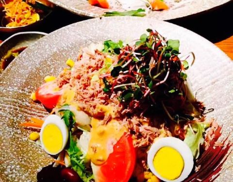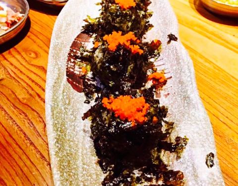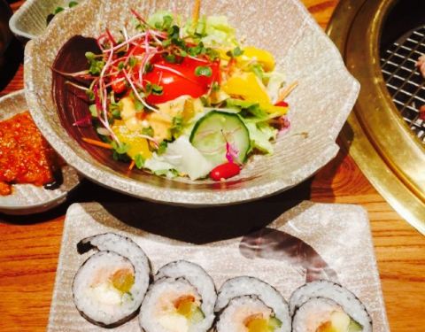 服务到位,可以帮你烤,当然你觉得妨碍聊天也可以自己试着去烤,换纸或者夹子挺勤的,记得吃过有一家,烤肉结碳要换夹子,说的“夹子也是你们自己烤的”没有对比就没有伤害呀,这家都是主动给你换那些工具之类的东西,应该算是融合料理,说不上是哪的,韩日。但是不难吃,有几个菜还是挺有心思的,比如沾满海苔的饭团,饭团里面还有佐料,挺不错的,肉质新鲜,看图片就可以看出来,肥瘦均匀,不知道是哪的肉,但是煎之前之后,硬和弹的变化,可以感觉出来是清新的,进门处的玻璃视窗里面也摆着他们家的肉,证明是清新的,我看上面包得纸,觉得是入口的,一些日式的料理做的也不错,摆盘精心,食材新鲜,凉菜口味中等,她们家招牌很吸引人,颜色亮丽,卡通图案和字体显得特别潮流,是个不错的去处,只是这种烤肉店,因为吃法的限制,大多都是这样开放式的,就是你吃饭时候和别人离得很近,韩国烧烤基本上都是这样,我是认为不是很有自在感,这个是题外话,她们家,好评。