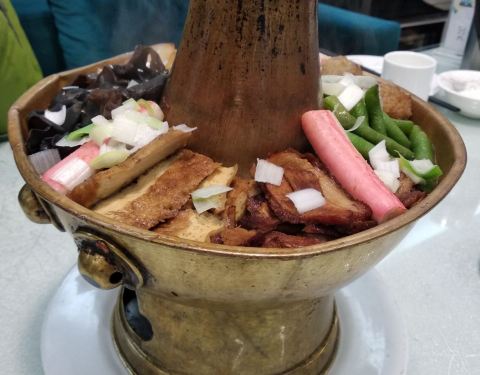 一家外观挺雅致的餐厅。 慕名而来为的是吃他家老太原铜火锅,的确好。 不油腻各色蔬菜都有,豆角白菜豆干五花肉等等,虽然会有点家常菜的感觉,但火锅底料不一般,绝不家常。 另一个是一个面汤,好喝极了。 豆面做的小面短短的qq的,汤都喝完了,小面打包带回家了。 就餐环境不错也卫生,服务员大姐姐挺好的,服务周到贴心。