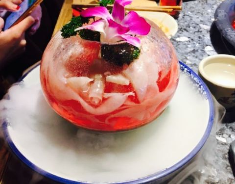 而且特别有特点,红糖糍粑和酥肉作为前菜简直不要太鲜美,最开心的还属菊花郡肝和鹅肠了,鸭血的颜值...