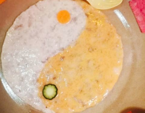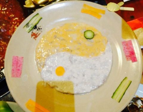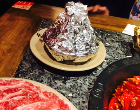乌鲁木齐今天一下降温了,真是太适合吃火锅啦。大门口和店内都摆着功夫熊猫,整个门店的装潢风格应该是以功夫熊猫为主题的吧。新开的店环境没啥说的,十分的卫生。锅底是辣味和三鲜的鸳鸯锅底,我们四个人都十分的不能吃辣,中辣的锅底都辣的有点吃不下,把锅里的辣椒挑出来还是辣的不好,最终都改吃三鲜了??。红糖糍粑应该是出锅后稍微凉点再端上来的,我本人喜欢吃刚出锅有点烫的那种感觉会更香一些。酥肉是放在铝箔纸里的,估计是为了保温吧,这个超级爽口,肉很嫩而且洒的干料麻麻的很爽口。鹅肠的摆盘还蛮漂亮的,鹅肠还是麻辣锅里涮出来好吃不然会有些腥。肝片和三丝肉卷都蛮嫩的,就是肉卷里有姜丝还得挑出来吃有点麻烦,花千骨是最后上的真的是吃不下了就挑了个小块尝了下,先是用料腌好的,跟别家的麻辣牛肉类似,味道也不错。土豆片一定下到锅里一定要赶紧吃,切的很薄,不赶紧吃就煮化了,太极虾滑是两种味道拼到一起,一种是原味一种是辣味的,服务生是把两种混到一起下到锅里的,并不会感觉辣,虾很清新,挺适合小孩子吃的。