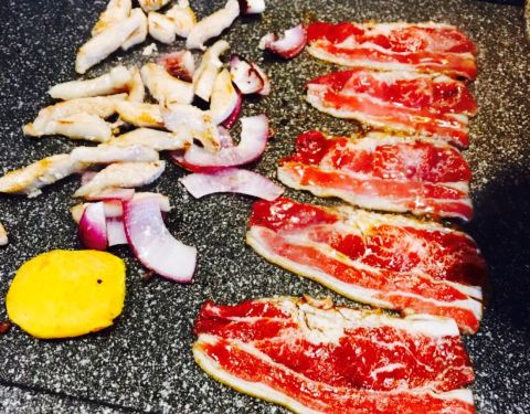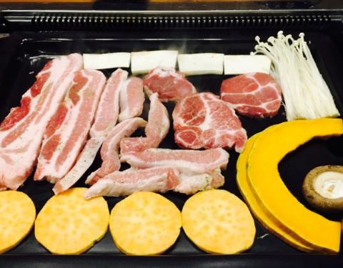 这家店就是吴铭火锅楼下,同一部电梯到二楼就行。店面不是很大。和朋友点了168的套餐然后还加了一份五花肉,点好菜后会有小菜赠送,还有一小碗南瓜粥。送的小菜里面有个土豆泥很可口。这个五花肉吧,没烤之前觉得肥肉挺少的,可是烤完后感觉很多肥肉,有些油腻。套餐里面有两种肉,一种是黑猪五花肉,还有一种好像是梅花肉,反正烤的有些老,咬不动。套餐里面还有一份芝士鸡蛋卷和一份铁板炒饭,鸡蛋卷跟厚蛋烧很像,但是里面没有味道。炒饭很鲜美。两个人太撑了,觉得可以三个人吃。整体不错哦,服务员还会帮你烤肉。