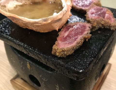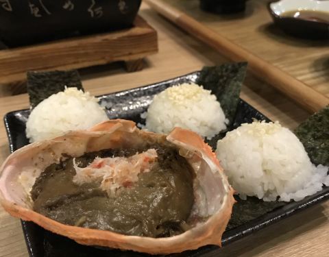 他们家在17楼 要从楼一下找入口搭电梯上来 一看到这牛肉就直流口水 这吉列牛必点 这牛肉用油先炸过表面熟内生 吃之前在烤盘上烤一下表面熟即可 肉吃起来十分嫩 但可惜肉有点小片吃起来不够爽快 味噌蟹盖配紫饭团...