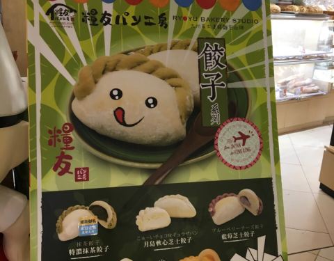 一田超市进门笔直往前,就是粮友工房。这家连锁店的logo:一个调皮可爱的小厨师,此刻不是像其他分店一样大大方方地站在店前,而是仅模样小小地出现在招牌上。最可爱的是特浓抹茶饺子,14元。
