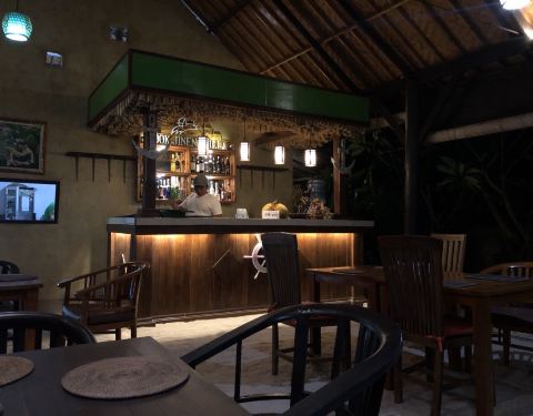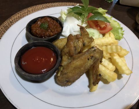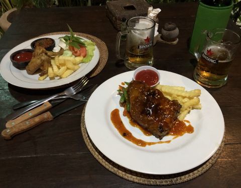 在蓝梦岛住的这家sedok jineng,为了看日落方便,位置不算太方便,附近也没什么店,晚上太黑也不高兴出去就在店里吃的。 选择还蛮多的,海鲜泰餐印尼餐都有,点了份冬阴功不知道为什么,味道还不错,有2只大虾,6月的印尼不太热晚上还有些凉意,喝了冬阴功一股暖意。另外点了猪肋排和鸡翅,把米饭都换成了薯条,胃口大开哦。 早餐也不错,有美式和印尼可以选,都要了美式的,有吐司和煎蛋,配果汁和咖啡,简单美味。