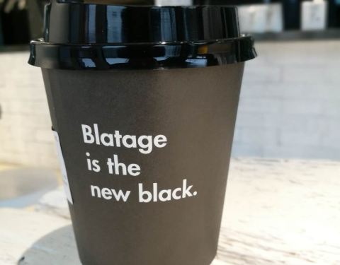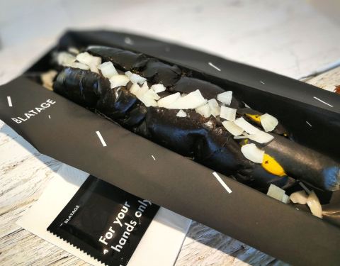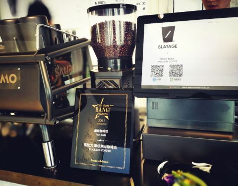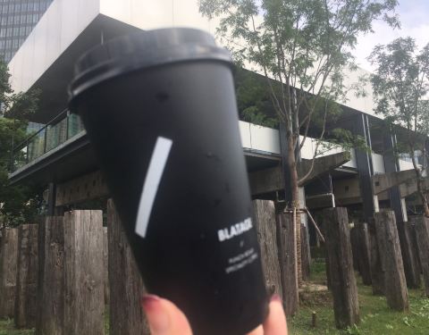 店名❤️:BLATAGE COFFEE 坐标:滨江艺仓美术馆不远沿江边上有家充满艺术气息的玻璃房咖啡馆,黑白色性冷淡风,连桌子都是不规则木质结构(虽然担心咖啡杯会放不稳洒落),可是就好似件艺术品~ (PS:超美腻❤️) 看了看咖啡名字是按照咖啡&牛奶比例取名,(黑叁叁、黑伍壹、黑柒肆、黑捌捌、黑百分百、黑壹贰零)挺有创意,百分比越高则咖啡浓度越高直接选了杯创意冰咖啡☕️,口味独特酸涩还是第一次喝到这么特别的咖啡。✨ 搭配☕️选择了经典美式黑热狗,简单的配料,黑️撒上洋葱,墨鱼汁香肠搭配口感脆香~✨