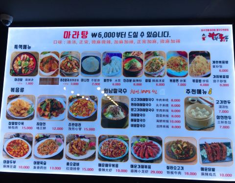 在韩国非常正宗的一家中餐,可以中文服务,主打麻辣烫麻辣香锅,反正我是觉得比在中国吃的还好吃,其它菜也很中国,连手抓饼都有,吃不惯韩餐的游客们,还有在韩国思念祖国美食的小兄弟们,可以来这里品品
