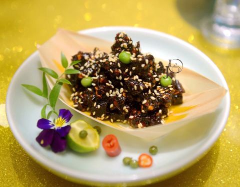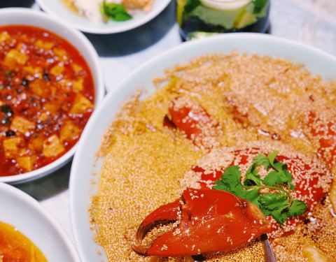 - 芝麻蟹虽然有些辣,不过辣在蟹壳外,蟹肉还是蛮鲜香有质感的。似乎每次去孔雀都是奔着鳕鱼狮子头的