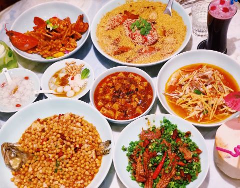 金孔雀,四川菜来到上海还是改良过了,红糖糍粑是每次都必点的甜品了,她家的装修风格算得上比较华丽的,有点金灿灿的泰国宫廷风格,还点了虾和担担面