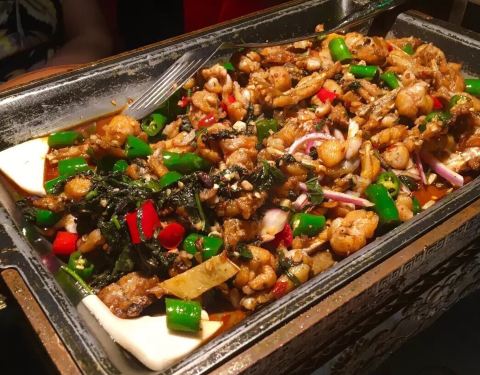 疫情过后这家餐厅终于有开门营业,吃上好久没有吃的牛蛙,牛蛙比较入味而且肉质比较结实,紫苏青椒味道很香,微辣,份量其实还算比较足,烤鸡爪筋也不错。