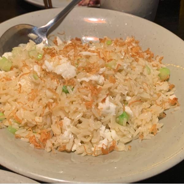 「瑶柱蛋白炒饭」米饭粒粒可见,有嚼劲却不太硬,油盐用得都不多,是清淡的炒饭。