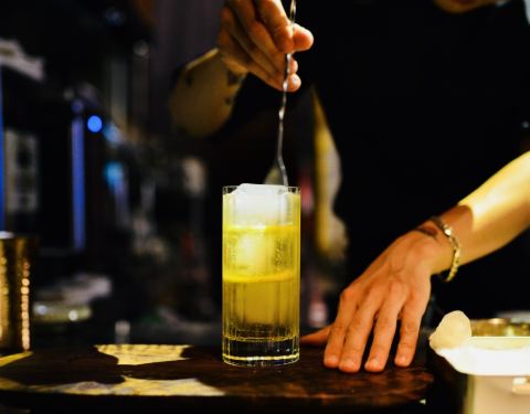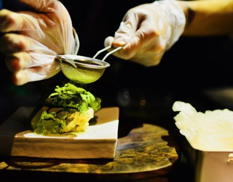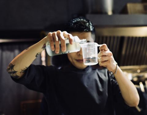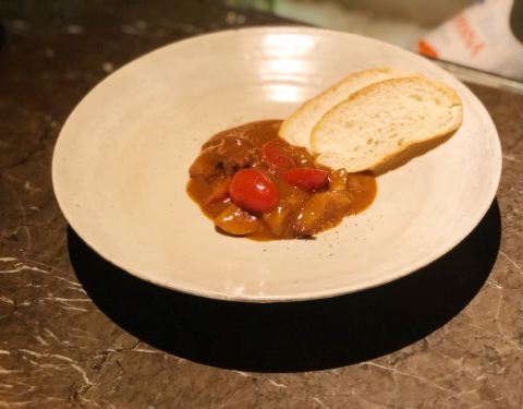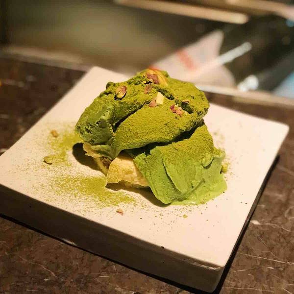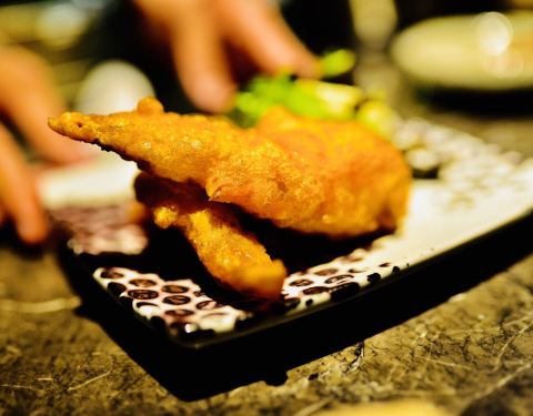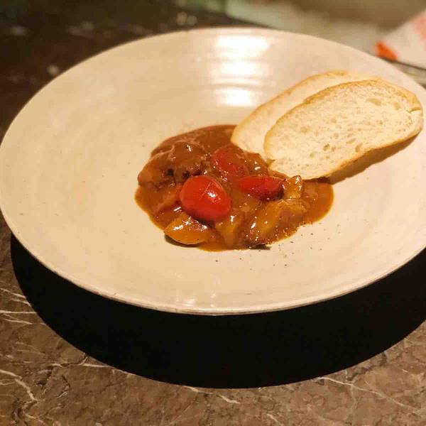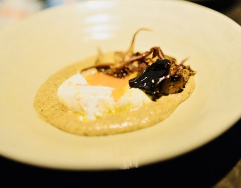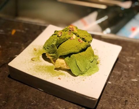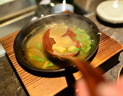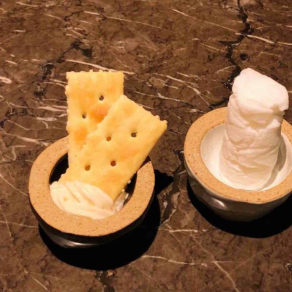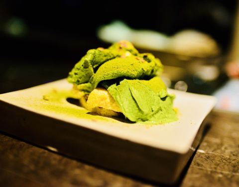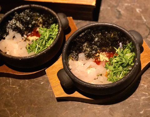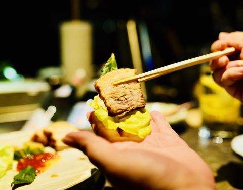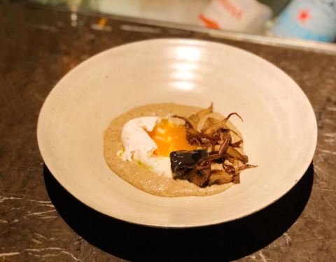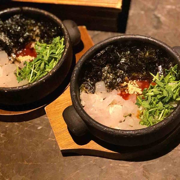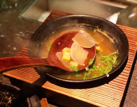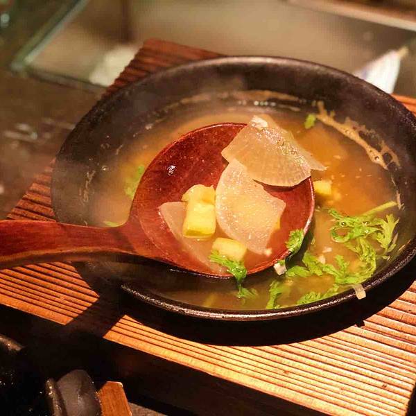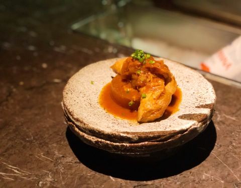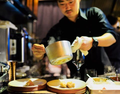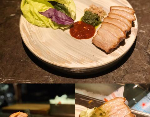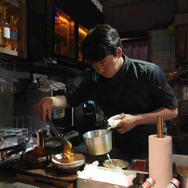 推开门,这门是生铁做的,我居然差点移不动。里面果然是客满预留了我们订的座位,核实了名字后入座,BGM还有点轻松活跃,CHEF还有酒保5人左右还有一个阿姨专门洗碗,算是幕后。坐在桌前,一个L形的,开始这次8月的赏味之旅。一共10道菜,大多数都是share的。 CHEF都还长得蛮有型的,不会尬聊,蛮热情的,还一直介绍韩国的吃喝玩乐和风土人情,不会太无聊,从一杯酒开始,还有个低配版的鬼怪,后面几道菜基本都是他做的。餐前小酒基本算甜,带有点酸,有点梅子酒的味道还不错喝。特别调制的色拉酱卷放在饼干上,蛮香的。一切就绪后开始头盘,伊比利亚火腿配马苏里拉芝士、节瓜还有茄子,口感蛮平衡的,不过过于咸,芝士好东西。黑松露搭配的温泉蛋和煸炒过的平菇,菌香突出,蛋液流出后混合在一起吃入口柔。 饺子我感觉没有大中华东北水饺好次,但是有其特色-kimchi,我都觉得微微一辣很醒脑。卡路里略微高一点的是葱香鸡翅,看着金黄色的外表还有点略油,但吃着吃着就觉得挺香,外面裹着一层粉炸的,在鸡翅膀里面还塞了很多调味过的大葱,算是惊喜。 辣炖萝卜鲅鱼,这个鲅鱼跟水饺里用的鲅鱼口感不一样,是青花鱼,属于鲐鲅,反正日料里也经常吃,我还是挺喜欢的,一点点辣味提鲜的萝卜蛮水润的,我喜欢。一个猪肉和一个牛肉是主菜,我个人更偏好猪肉,用的是长白山的黑猪肉,肥瘦各半但吃着不腻,包生菜吃加三款混合酱更好食,通常虾酱算是特色,配猪肉擦出不同火花。 面包是两片薄薄的,卷上炖牛肉的酱汁一起,口感丰腴浓厚,牛肉炖的也酥,这道吃好已经挺饱了。下面又来了一份饭,比目鱼生鱼饭,看到厨师在砧板上磨刀霍霍向比目鱼,是活的哦,肉质不能再嫩弹了。切成颗粒状,加上海苔、泡菜酱等,饭稍微有点僵,不知道是不是和risotto一个道理,不过我还是喜欢好的日式寿司米那种口感。汤对于我这种喜喝汤的人来说还是不错的,韩式辣汤完全能hold住的辣度,里面又节瓜、土豆片还有小海鲜,汤很鲜美,不油腻。 最后天平是一道看似比较粗狂的带有层次感的提拉米苏,覆盖了很多抹茶,甜度均衡。 总体来说还不错,室内空间比较小,排风不是特别灵光,吃完身上烟火气较重!