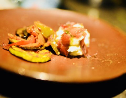 一切就绪后开始头盘,伊比利亚火腿配马苏里拉芝士、节瓜还有茄子,口感蛮平衡的,不过过于咸,芝士好东西