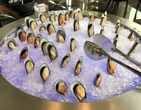 餐厅装修风格摩登现代,提供种类丰富的自助餐品,琳琅满目,摆盘精致。为了保证出品口感,还有现烤的牛排、生蚝、羊排等,火候把握的极好,口感令人愉悦。