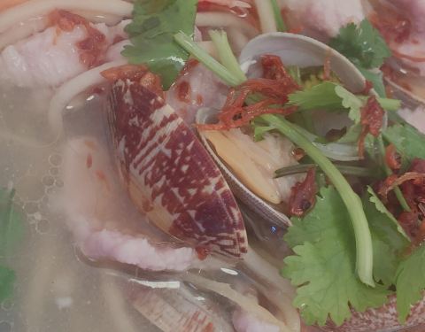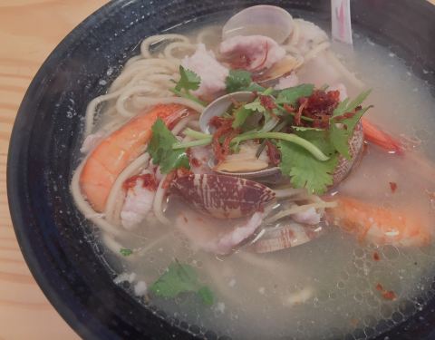 ∠( ᐛ 」∠)_ 点单时,点了全店唯一的一道面,吃完后,神马!!! (╯°Д°)╯︵ ,“元”后的括弧是神马鬼,除了面,居然还有面线、河粉,除了海鲜,还有猪肝、瘦肉…我这眼神呀,算了,其他的以后有机会再慢慢挖掘吧。 「海鲜面」,喝第一口汤,“叮”!!!“90分”,汤头太棒了,好好喝。用料也给得很足,海虾、花蛤、瘦肉、小肉丸、青菜,18元,很值得,不过,面会少点,男生的话,可能得再加点。香菜是认认真真的芫荽,非芹菜,不吃香菜党要注意了。 小饭馆,服务不能有太多要求了,生意太好了,桌上碗筷只能自己动手挪了。