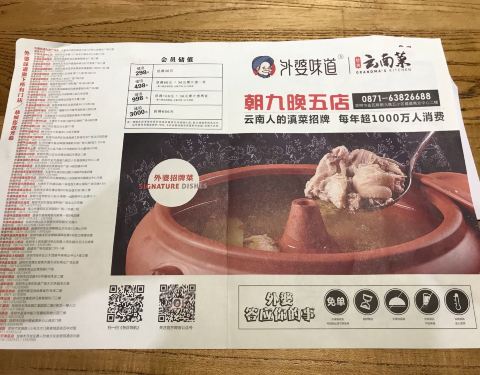 外婆味道(朝九晚五店)位于昆明金瓦路福缇商业中心二楼,地理位置不错,交通便利。 这家店门面较大,门口除了摆了很多凳子,供等位的顾客坐,还摆了不少水果、瓜子等零食。 我是六点以前到达的,餐厅还有不少空位,后来顾客越来越多,最后要在门外排队等候。 餐厅很大,门口附近有个大的消毒柜,摆了满满的已消毒好碗筷,供顾客自取。 【丽江紫洋芋】紫洋芋切成片,煎得很香,有点咸。 【外婆小炒肉】五花肉切的很小,炒的很香。吃起来很油、有点辣。 【手撕莲白】莲白炒的又咸又辣。 【芋头炖白菜】清汤寡水的,不合我这个食肉兽的胃口。 【水煮肉片】肉片比较嫩滑,铺底的白菜挺好吃的。 服务员态度非常好,服务到位。