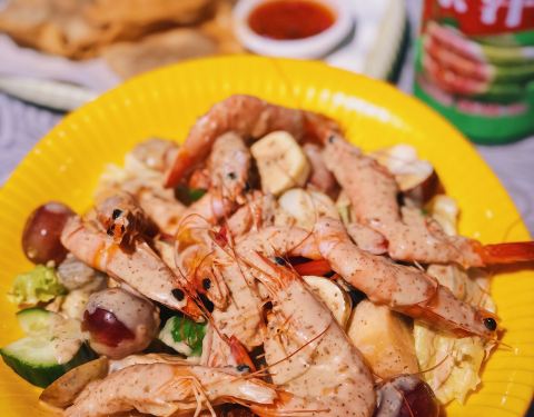 ...以清新爽口的生菜,还有圣女果哈密瓜黄瓜葡萄火龙果及脆枣丰富口感,浓郁的千岛酱汁搅拌均匀非常入味