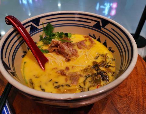 最近迷上的一家面店 开始尝试了酸汤肥牛面 这次尝试了酸汤猪软骨面 真的是好好吃呀 汤底有浓烈的当归味 还可以免费加汤加面 服务态度也不错的 这家分店开放式的 距离拉得比较长 卤蛋也好好吃 拿好餐位卡放在餐桌上 等了一小会儿面条就来了 出新品还会再来的