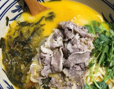以前在五角场那边的和府吃过,这家在长寿路巴黎春天里新开的,地方不太。我们三个人各点了一样面。雪花牛肋条面最贵,78元一碗,里面的牛肉非常扎实,口感酥嫩,但性价比不算高。蟹黄油笋衣面的确有蟹味,笋衣很嫩,还有很多蛋皮切成的条,淡而不腻。酸汤肥牛面质量也不错。