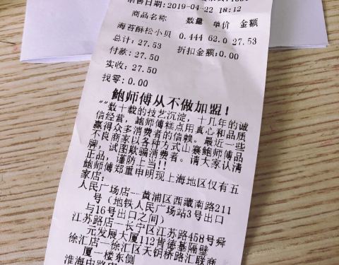 买了8个海苔酥松小贝,老公吃了一个,剩下的和办公室的同事们分享。 和老公先前吃过别家的,终于明白难怪鲍师傅会有这么多人排队,肉松,海苔碎,蛋糕,沙拉酱完美组合在一起!好吃到忘记了热量! 下次还打算尝试其他的产品~ ⚠️上海就五家分店: 人民广场店,江苏路店,徐汇店,淮海中路店,五角场店‼️其他均为山寨‼️