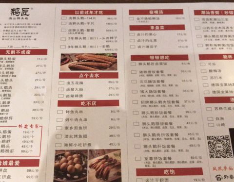 家门口路过无数次 本来想去吃楼上餐厅 苦于要排队 索性就下来吃了 味道还不错 服务还需要加强 点了鹅肉和鹅翅 下面都配了鸭血 蘸料碟是问服务员才送上来的。隔壁桌看我们有两种酱料也喊服务员上了一份,可见不是偶尔遗漏 是经常 酱料碟蛮好吃的 个人喜欢浅色那款 男票喜欢卤汁那款 还点了一份泡饭 送的三份咸菜的碗碟多少都有摔破的瑕疵。。。这三份咸菜 有橄榄菜等 个人觉得有点偏油了 本来点粥就是想吃清淡点。粥里放的是芹菜 应该是潮汕做法 给的茶水是砖茶类似口味 蛮特别 要是能自配牛奶 就是超级好喝的奶茶啦 服务还需要加强培训 味道不错!鸭头和鸭肠貌似也不错 可惜不吃这些奇奇怪怪的部位