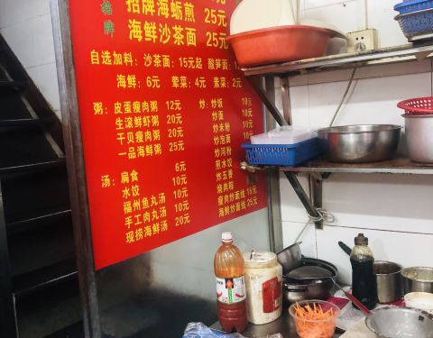 「海鲜沙茶面」鱿鱼,花蛤,海蛎仁,明虾,多种多样的海鲜品类,沙茶汤头浓郁,蒜蓉mix花生酱香,十分不错。 「海蛎煎」很家常,放了蒜末和鸡蛋,是厦门人家传统的风味。 位于水仙路跟泰山路连接的这条路上,门面有种老厦门气息。