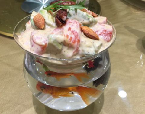 与朋友在遵义南路88号协泰中心三楼的顺风大酒店聚会,这是阔别顺风后的第一次。 如今的协泰中心内部看上去有点陈旧,但进入顺风后,其装修装饰等倒是感觉耳目一新,气势蛮大的。 看了菜单,️过去熟悉的,️推陈出新的,因此,照着这个思路,兼而有之。出菜的速度很快,首先第一感觉是,顺风现在的菜盘,摆盘很漂亮,也很标新立异,视觉效果很好。 因为视觉好,味蕾很快打开,我们按照上菜节奏,逐一品尝。 今天点的菜基本按照每人一冷一热的比例,一开始还担心量不够,但此担心已被足足的菜量所打消。 冷菜的色香味都很好,如手撕上海咸鸡、老醋海蜇头、墨鱼大烤,尤其是牛油果三文鱼,不但食材新鲜,酱料调得好,托盘用的是有两条小鱼游动的小鱼缸,立意独特! 热菜的色香味总体也很好,如葱油红膏蟹、石烤虾、干煎小鲳鱼、鳝糊、红烧肉、蜗牛土豆泥、草鸡蛋炒木耳等,但鲍汁凤爪虽酥烂,鲍汁味不够浓郁;煎臭豆腐过于焦黄,味道有点苦。这两只菜无伤全局,相信顺风以后一定会注意的。 在这次就餐中,服务人员中规中矩,热情细致,应该点赞