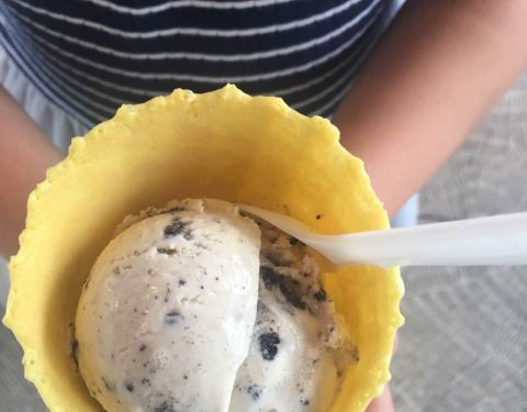中环百联一楼,店家沿街,店外放置了很多座位,店堂内面积不是很大。 团购的冰淇淋,排队等了一会,验证倒是方便。选择了两款季节限定的,出了店门一会,冰淇淋就开始融化,往下流淌,是不是没冻好? 店员服务很好,店里人很多。