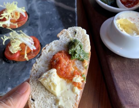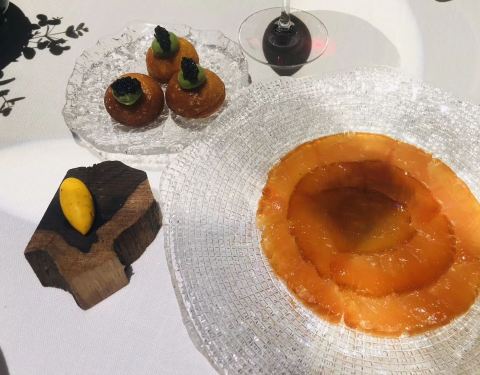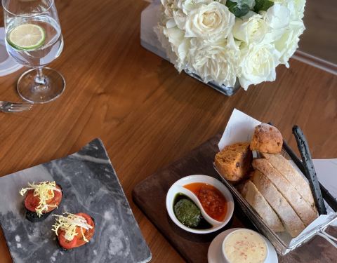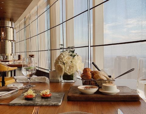 总评: 这是第二次光顾了,生意比之前要好。 餐厅视野特别棒,特别在夏季的晚餐时间去,七彩的漫天晚霞棒呆了。 高空靠窗位,周到细心的服务,精致的餐食,一切都很美好。 建议啊,如果是什么纪念日之类的节气,选这家没毛病。 评分:88分 性价比:❤❤❤ 提前预约了靠窗位,从傍晚坐到天黑,看着窗外的蓝天白云,变幻成粉紫色晚霞,再到夜幕降临,城市灯光星星点点,灯火阑珊。 不同的时段都有不同的美,心情的愉悦程度一直高涨,突然觉得很适合求婚呢。哈哈! 选了2份套餐。这样比较省心啦,不用挨着点菜,全凭安排。 【餐前面包】有三款,然后配了三款特制酱,很特别,我还蛮喜欢绿色的罗勒酱的; 【前菜】 凯撒沙拉。 平日里也挺喜欢吃这款沙拉的,基本上是首选,他们这人的酱汁拌得刚刚好,不会很浓腻,清新脆嫩; 【汤】招牌洋葱汤。喝过很多洋葱汤,他们家一定是颜值最高的,用一个生洋葱做器皿,一起蒸烤,汤熟了,洋葱也软了,洋葱味是从里到外的散发阵阵迷人香气。 【清口小吃】柠檬香槟雪芭。作为主食之前的清口小食,这个真的是很棒了,冰沁爽口,清新解腻,前面洋葱汤的浓郁气息都一扫而空了。 【主菜】二选一,有大西洋黑鳕鱼和澳洲肉眼。两款都尝了尝,女生呢建议点鳕鱼,男生点肉眼。鳕鱼很厚实一块,还包裹了一层帕尔玛火腿薄片,咸香鲜嫩,搭配得很妙;肉眼五分是最好的,配了几款酱汁,各有风味,但撒上一点海盐和黑胡椒颗粒就足够了。 【甜点】芝士蛋糕。这个似乎是最经典的西式甜点,浓醇厚实,搭配新鲜浆果,甜酸不腻。 每上一道菜,服务员都会认真介绍,餐间的各种服务都不多不少,分寸感很强,值得夸赞。