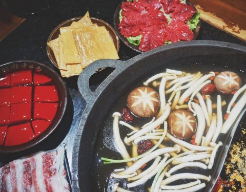 网红火锅店了吧,排队可厉害了, 还好有小伙伴提醒四点半去可以直接进去… 重庆人吃饭一般吃得挺晚的,宁可早去别晚去哦。 一进去就一股浓浓的麻辣味,不断打喷嚏, 虽然自认为还是个挺能扛辣的妹子, 但是一顿火锅吃下来感觉像个感冒患者, 我还点的只是微微辣,建议辣锅上来就撩走辣椒, 还好点的是鸳鸯,菌菇这半还不错,料足, 调料一定是要香油➕蚝油➕香菜➕蒜泥, 万能调料还解辣,这里也只有这一种调料… 这里鸭血很好吃,久煮还是很嫩, 还有鸭胗,烫几秒就可以撩起来了,会缩水, 贡菜丸子也挺有特色,虽不知贡菜是什么, 但不同于香菜,吃着挺脆的… 还有冰粉必点,绝对是解辣好帮手,一秒恢复… 很多菜量都是可以点半份的,挺适合两个人。
