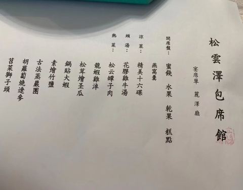 松云泽重现当年荣乐园筵席之风采,美食美器,重味重汤,仪式感十分强。是川菜大师蓝光鉴先生荣乐园所传下来的门派,大厨王开发是蓝光鉴先生的二代弟子。环境典雅大气,从开席盘到随饭菜一共有十八道,根据时令而更迭。每天只接受六桌,必须提前预定,不接散客不点菜,一切都按照成都筵席的标准、礼仪、流程来进行,在这里你能尝到川菜的百菜百味。