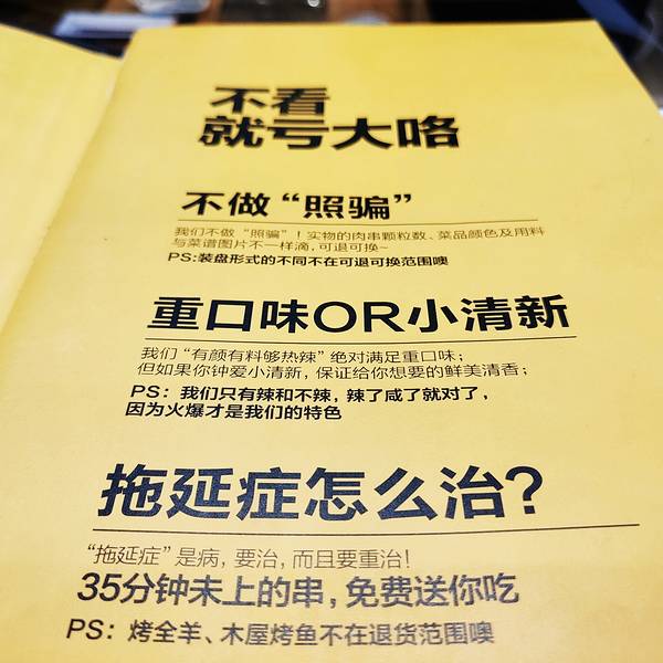 不得不说【35分钟未上的串,免费送你吃】的承诺还是很能安抚食客"嗷嗷待哺"的躁动