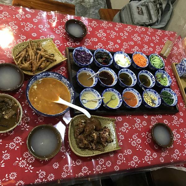 参观完张掖丹霞,直接出发往嘉峪关,车行三个多小时,到嘉峪关已是夜宵时分了,团费不包晚餐,同团的小伙伴搜到了附近的一家当地小吃特色的面馆,就在离酒店不远的地方。长方形盘子里的一个个小碗盛的都是调料,...