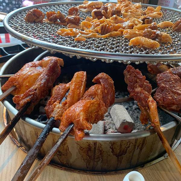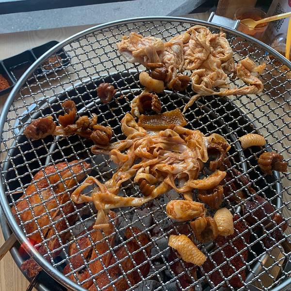 同事强烈推荐得一家烤肉店,周末有时间前来探店。 关于停车: 因为是在汽车市场里,停车区域很大,自驾放心停车。 人均:70元 必点招牌菜:生菜包五花肉 环境: 环境比路边摊略强,桌与桌之间相隔距离较窄。烧烤店里的温度比外面高出至少5度,虽然每一桌都有排烟的管道,但是当窗子打开时就无效了。 下午5点半到店,已经开始排队了。先到拿菜区,选好自己想吃的烤品,有夹子夹到铁盘子里,称重计费,剩下的就是等位了。等了20分钟有位,还是靠窗的位置。 坐下后服务员核对了叫号单和之前拿的烤品,熟练地烤制起来。上面的网状烤盘用来烤制鸡皮、鸡脚筋、小瓜片等小东西。排骨和招牌五花肉则用竹签串起来。 服务: 有服务员定时前来翻烤烤品,不用担心烤焦。五花肉烤熟后会帮忙剪成小条,方便客人食用,服务还不错。 蘸碟有三种,鲜红色辣椒面、黄色辣椒面和酱料,个人更喜欢加了葵花、花生末的黄色辣椒面。 味道: 1、五花肉:招牌就是不一样,选用的猪肉很新鲜,烤制时香味扑鼻,直咽口水。五花肉烤熟后用生菜包裹起来,撒上辣椒面,一口下去嘴里冒油,爽! 2、排骨:排骨性价比要低一些,同样是称重,骨头占了一大半的重量。但是和安顺专门的烤排骨店相比,性价比却又突出很多。紧贴着骨头的肉质紧致,无多余肥肉,适合注重体形的女性朋友。 3、鸡皮:烧烤的必点菜品,烤出来的油脂可以让炭火不至于熄灭。鸡皮烤到微微有些收缩时最好吃,适合大肉爱好者。