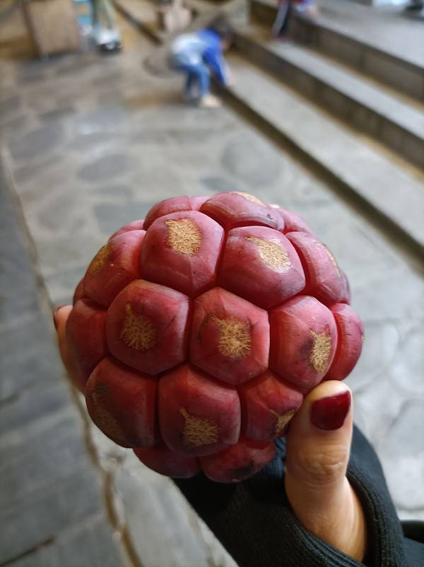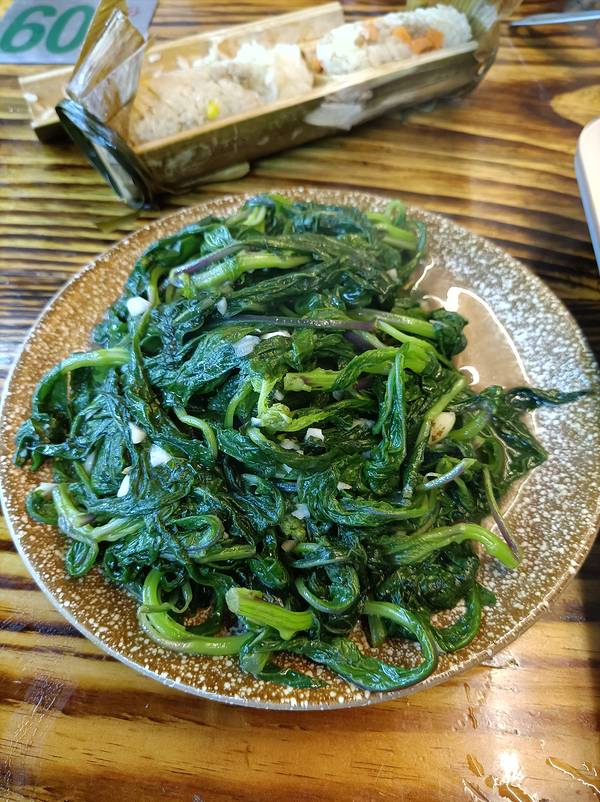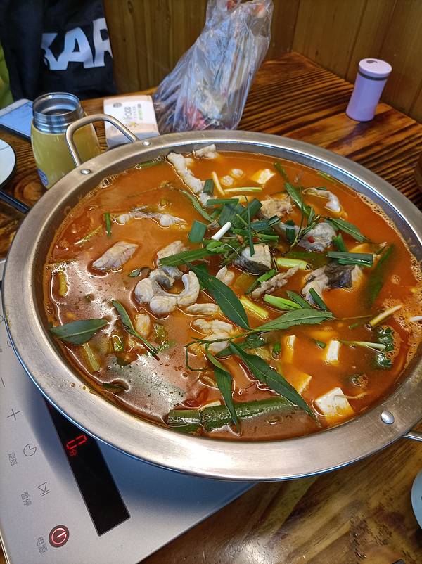 在侗寨逛到晚饭时间,在大街上找饭店吃饭去! 来到侗寨,当然要试一下侗族菜,就近选择了评论还行的 侗家佬,就在大街上,一楼只有几张桌子。 这边最有特色的,应该要数酸汤火锅、牛瘪火锅了。几乎每家店都有。牛瘪过于重口,所以还是试一下酸汤鱼吧。 鱼用的是江团鱼,相当鱼刺少一点,一条大约2斤多,现做现杀,加上酸辣汤、当地的香料,味道非常特别。味道酸酸辣辣的,鱼肉很嫩。因为是火锅,味道会越煮越浓,我吃着还行,小姐姐是受不了了。吃的比较清淡的,还是要慎点! 酸汤鱼是有配一份青菜的,但我们都想尝新,就点了一份炒野菜,味道想茼蒿,但不知道是不是同一样菜! 吃饱回客栈休息去!回去的路上买的“恶魔果实”,这边的叫法是老虎果。价钱贵,果肉很少而且多核,而且没什么味道,不建议买,除非是想猎奇的!
