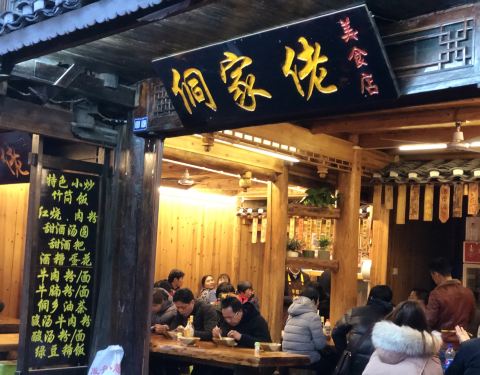 在侗寨逛到晚饭时间,在大街上找饭店吃饭去! 来到侗寨,当然要试一下侗族菜,就近选择了评论还行的 侗家佬,就在大街上,一楼只有几张桌子。 这边最有特色的,应该要数酸汤火锅、牛瘪火锅了。几乎每家店都有。牛...