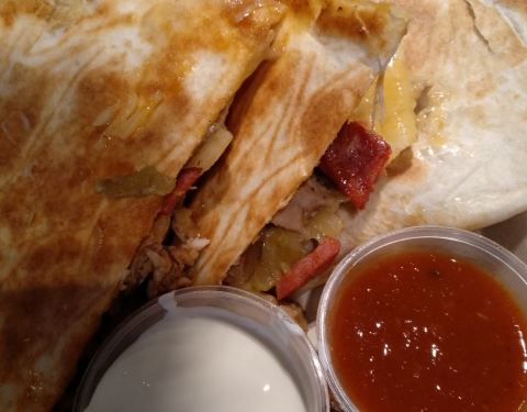 附近餐饮不多,吃腻了披萨,炒面。就来尝尝这个。 先是选择饼的种类,然后加料 看我们盯着点餐牌。服务员还过来特地介绍。我点了一个煎饼类的。一个比较大大的饼里面加料。我选了鸡肉和香肠。然后两边合起考了一下,切成几片。挺香的,蛮好吃的。另加了一份taco 那个一般 还是煎饼那样的好吃 就感觉一份有点少 就切了四小块 11.5一份哈