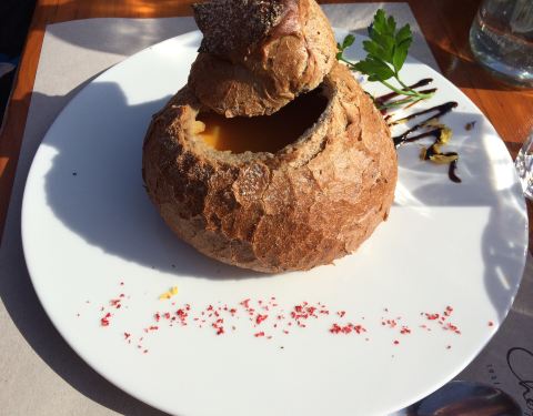 Try the delicious pumpkin soup in farmer's bread.