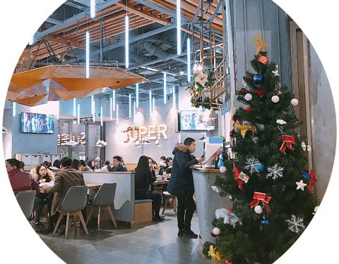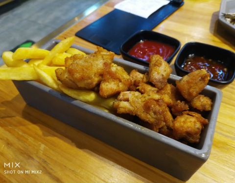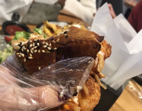 最近在和平大悦城挺火爆的一家以大汉堡为主的餐厅~在一楼~是半开放式的餐厅~所以店内比较冷~需要多穿衣服~环境偏简约工业风~ ⭐鲜虾四人汉堡⭐八寸的大汉堡分为四份~很厚实~虾肉很多~除此之外还有挺多的蔬菜、洋葱酥~汉堡皮软软的略甜~油有点多~味道不是很好~ ⭐主厨推荐沙拉⭐沙拉酱挺多的~ ⭐墨西哥玉米脆配辣味牛肉番茄酱⭐脆脆的没什么味道~ ⭐炸粗薯条&炸特制鸡球⭐放在一起了~鸡肉有点老~粗薯味道还可以~ ⭐乡村辣鸡翅⭐量挺少的~辣味不是很浓~