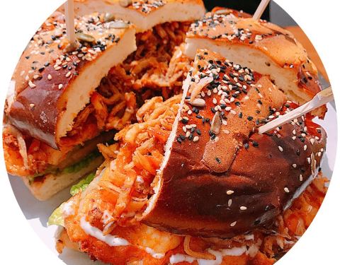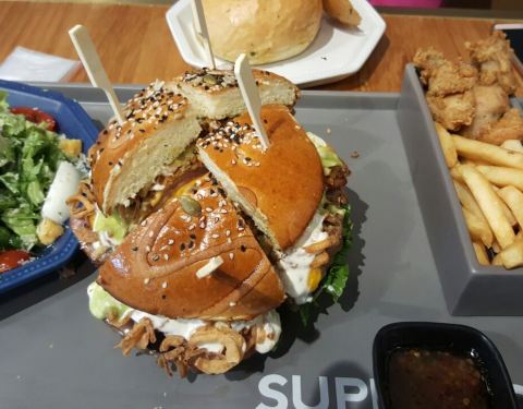 超想吃这家super boom 大汉堡的,每次去都超多人。这次果断打包,没位置没办法。 这里主打各种牛肉猪肉汉堡。餐具很有逼格 ,金色的刀叉,非常符合网红店的画风,约会和闺蜜小聚都非常适合~优美的环境,加上美味的食物,希望下次来可以到店里体验一下。 【秘制手撕猪肉堡】料非常丰富,炸得外皮金黄酥脆内里松软香甜,配上新鲜的生菜叶、西红柿片、酸黄瓜条,当然还有手撕的猪肉,丝状的猪肉一点都不塞牙,很入味,有一种烧烤的味道,咸鲜微甜,超级好吃,推荐! 【鲜虾海鲜堡】虾饼不是碎碎的虾蓉,而是大粒的大虾肉,调味有一种马来西亚香料的味道,口味偏淡。 旁边还有同名水吧,里面有各种奶盖水果茶和水果派。水果派目前没有,奶盖茶一般般,不推荐。 点118的双人套餐超划算的,饱腹感十足。 汉堡很大,两个人根本吃不完,我们都只吃了一大半,套餐里还有小吃拼盘,薯条+鸡块,还有蔬菜沙拉。不过每个人口味不一样,我是比较喜欢那种不甜腻又浓浓的味道的。薯条给了三种沾酱,甜辣、番茄、芝士酱。厚厚的澳洲安格斯牛肉饼!这里会给给一次性手套,直接拿在手里啃,牛肉饼一点都不觉得干!对于一个食肉动物来说超级满足。推荐大家来尝一下,绝不后悔!
