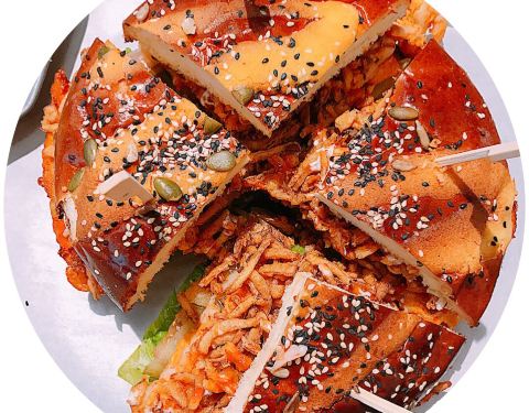 ⭐鲜虾四人汉堡⭐八寸的大汉堡分为四份~很厚实~虾肉很多~除此之外还有挺多的蔬菜、洋葱酥~汉堡皮...