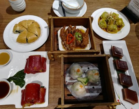 终于揾到一日黎禄运茶居啦,听闻节假日排队排到丧,于是等到工作日午市先去,呢个决定系啱既,因为始终都有位。2个人坐4人台,唔需要搭台,而且套餐个7碟点心都够地方摆。 坐底验证俾钱后好快就上菜了,菜单个度茶...终于揾到一日黎禄运茶居啦,听闻节假日排队排到丧,于是等到工作日午市先去,呢个决定系啱既,因为始终都有位。2个人坐4人台,唔需要搭台,而且套餐个7碟点心都够地方摆。 坐底验证俾钱后好快就上菜了,菜单个度茶位有三个价钱段,最平6蚊,最贵10功夫茶,我地个餐系中间8蚊既,我理解就系加料茶,有几种选择:小金柠(即系红茶+柠檬),小青柑(普洱+青柑),桂花+铁观音……我就要红茶+一只干柠檬,开始时就饮到红茶,浸得越耐先饮到柠檬香同d“劫”味。 因为有7个点心,我地知道肯定食唔晒,所以先食晒d打唔到包既,打到包既推到最后有余力先食。 咸香鸡丝鱼茸粥第一个上,粥底几棉,少少鸡丝同鱼肉,味道清淡。 金牌虾饺皇,一笼三只,特登剥开只虾饺皮数数,里面竟然有7粒虾仁,啖啖都系虾肉啊,店家惊s唔够爽,面头仲要撒虾籽添。 豉椒蒸凤爪,有dd辣,够霖够入味,合格。 云南小瓜金钱饺,将d云南小瓜剁到细过米粒,同猪肉捞埋一齐做饺子馅,呢个点心比较清淡。 脆皮有机红米肠,又系虾肉!包住炸脆,再裹红米肠皮,因为虾肉炸过又包肠粉有的油腻,肠粉本身味道又清淡,配左一碟豉油一碟芝麻酱,点豉油食感觉一般,点芝麻酱食呢更加“笠口”,提个建议不如配碟喼汁或者醋,酸味酱汁可以解油腻又开胃。 脆皮葱油饼,里面系葱粒,外面皮炸脆,新鲜食几香口松软=热气,所以一件就收手。 剩低红枣糕同葱油饼打包。